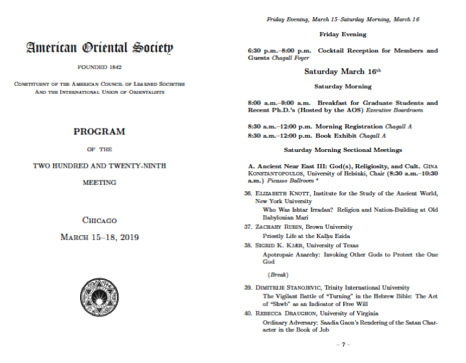 American Oriental Society’s Annual Meeting Conference, Omni Hotel Chicago, IL, March 15-18, 2019. Read the paper: The Vigilant Battle of “Turning” in the Hebrew Bible: The Act of “Shwb” as an Indicator of Free Will.